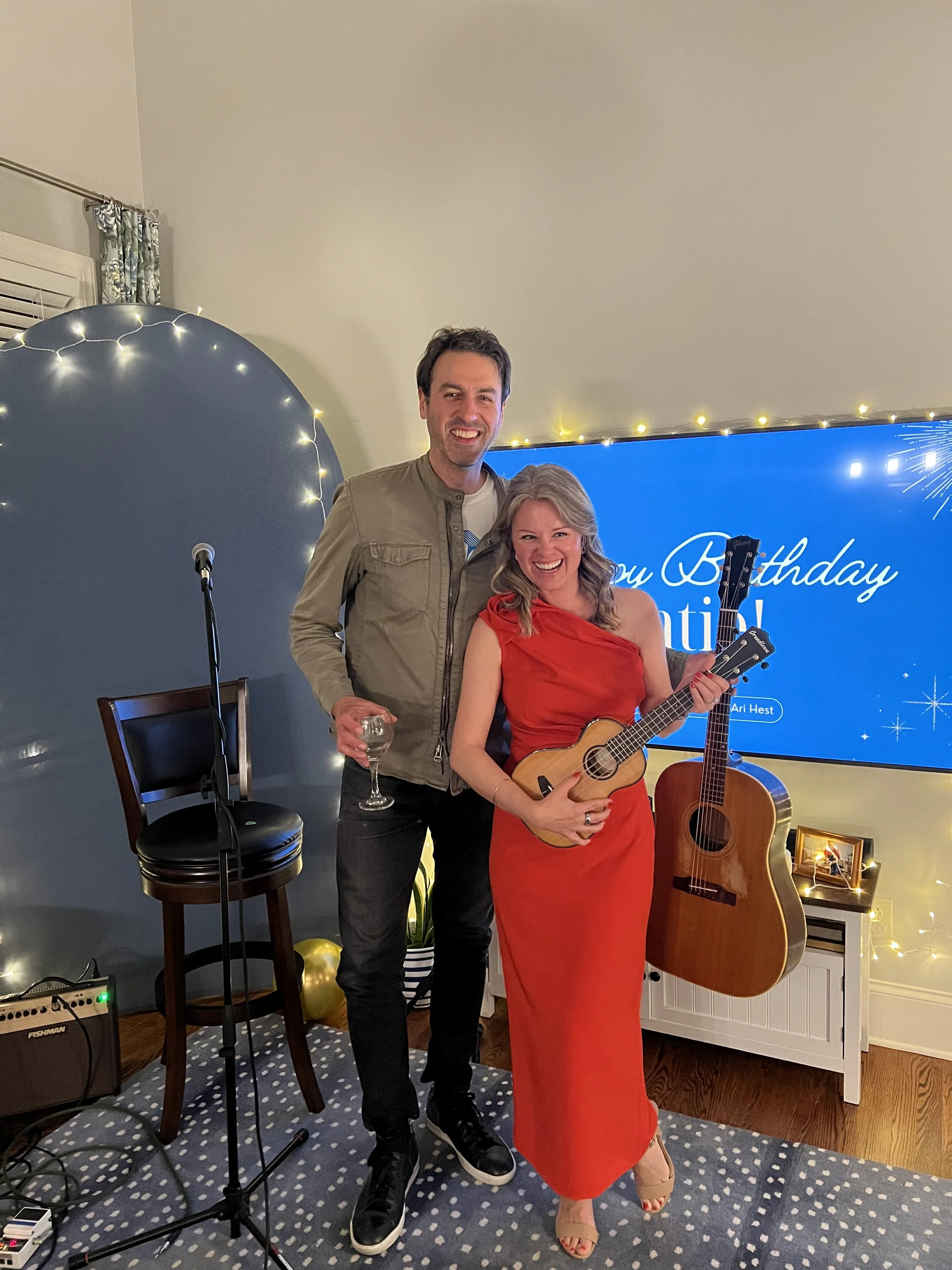 I celebrateda milestone birthday last weekend! This is one of my favorite party pictures. Ari Hest gave a private concert at my house. We had a good giggle over the size ratio of him to me and the guitar to ukulele.